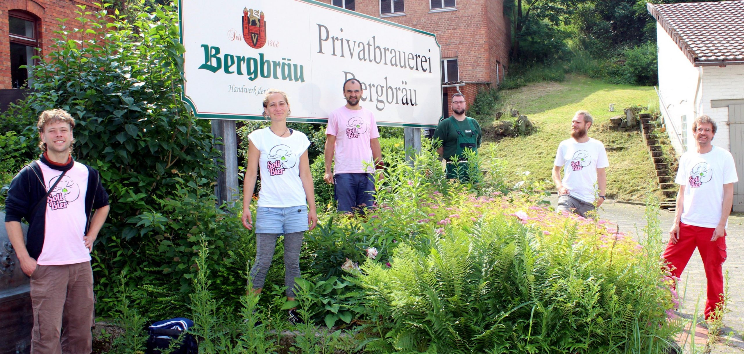 Uslar, Brauerei Bergbräu, Verein Solibier aus Göttingen, braut in Uslar Bier, Naturtrüb, und verkauft es, um soziale und nqachhaltige Projekte zu unterstützen, im Bild vor der Uslarer Brauerei (von links) Karl Sundermeyer, Esther Jutzi, Phillip Bastian, Uslars Brauere Adnreas Nix, Lars Jung und Fabian Gabriel, Foto: Frank Schneider